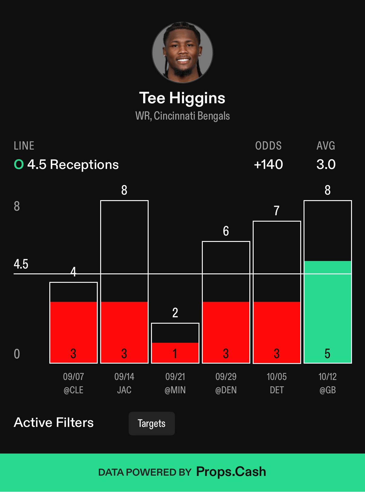 As you can see, in the three games that Browning started, Higgins had 2, 6, and 7 targets. Last week with Flacco, that jumped up to 8 targets, which he converted into 5 receptions. It was the first time this year he had at least 5 receptions, and like we said earlier, he has a great matchup to build on that tonight.
