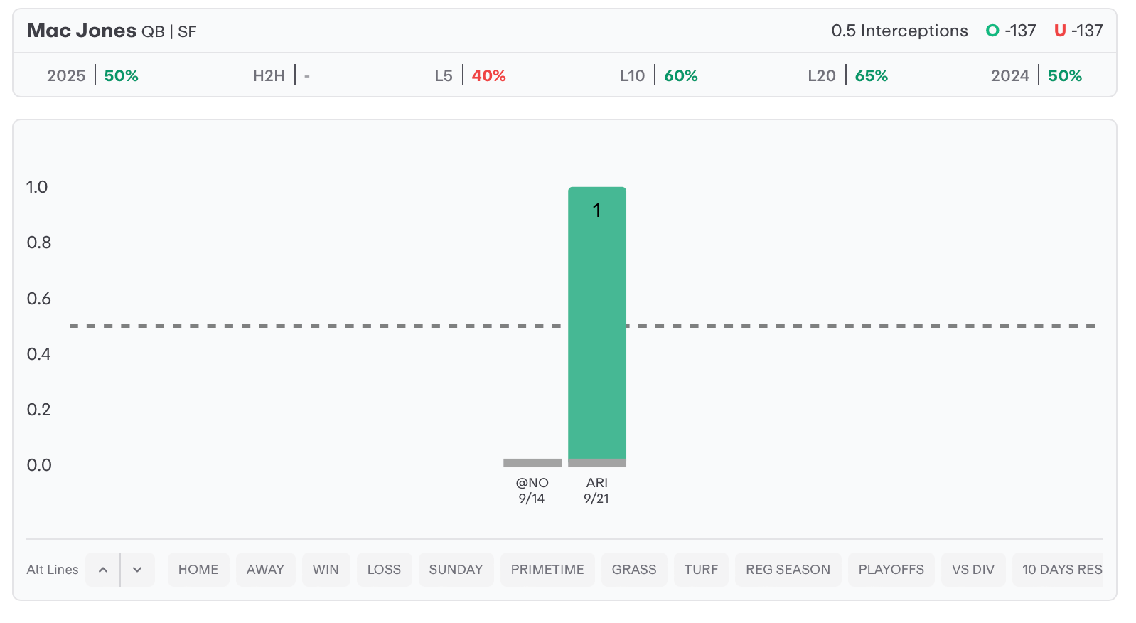 After 0 INT in his first start, Mac Jones tossed one last week, and now he takes on a 49ers team that has 3 interceptions through 4 weeks. They picked off Daniel Jones twice in week 4, and with the 49ers dealing with a lot of injuries, it will remain to be seen if any miscommunication happens with these players tonight. Also, if the 49ers fall behind, they will need to throw the ball more, which can lead to mistakes.