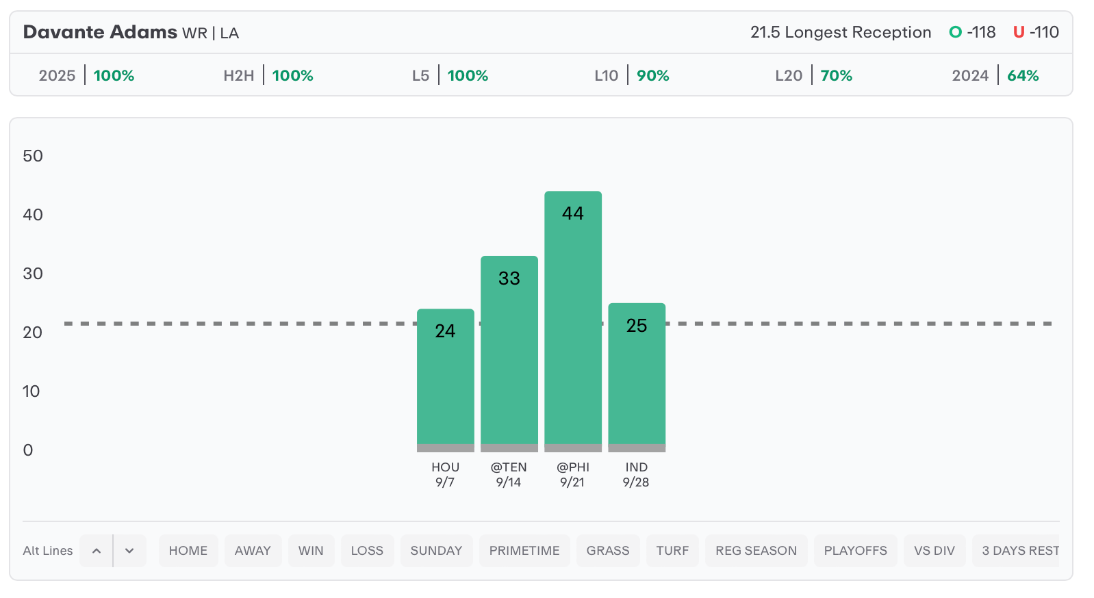 Through 4 weeks, Davante Adams has cleared his 21.5 longest reception line in each game, with a catch of at least 24 yards in 4/4. The 49ers have allowed a receiver to hit this line in all 4 of their games.