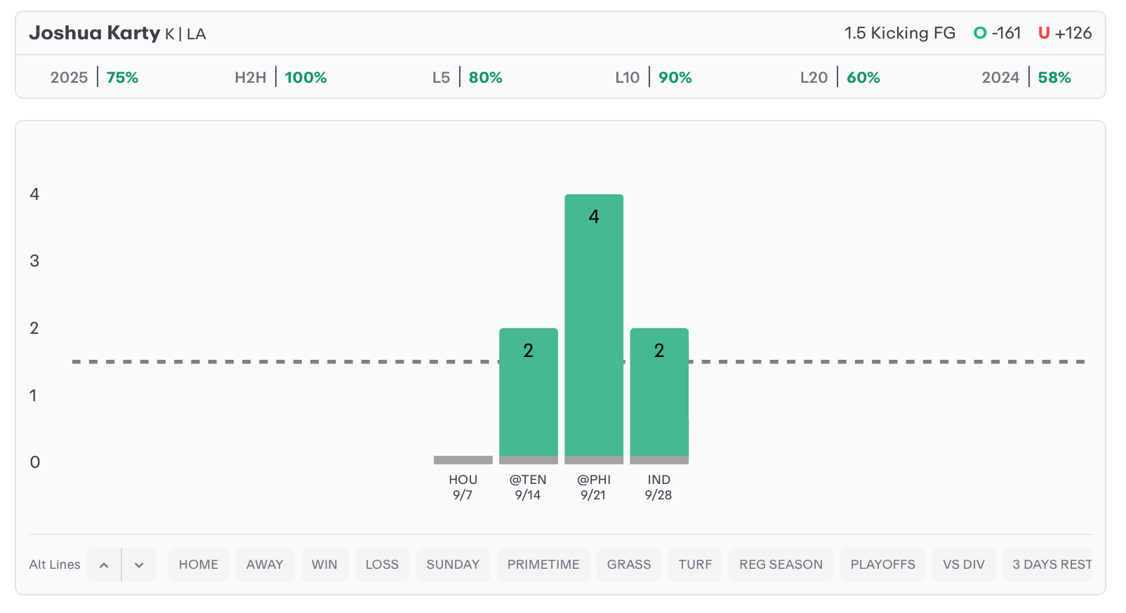 Through 4 weeks this season, Joshua Karty is over 1.5 FGM 3 times, with the lone miss being week 1 against Houston. He should stay busy tonight against the 49ers. They come into this one allowing 2.3 field goal attempts per game, and in two meetings last season, Karty made 2 and 4 FGs against them.