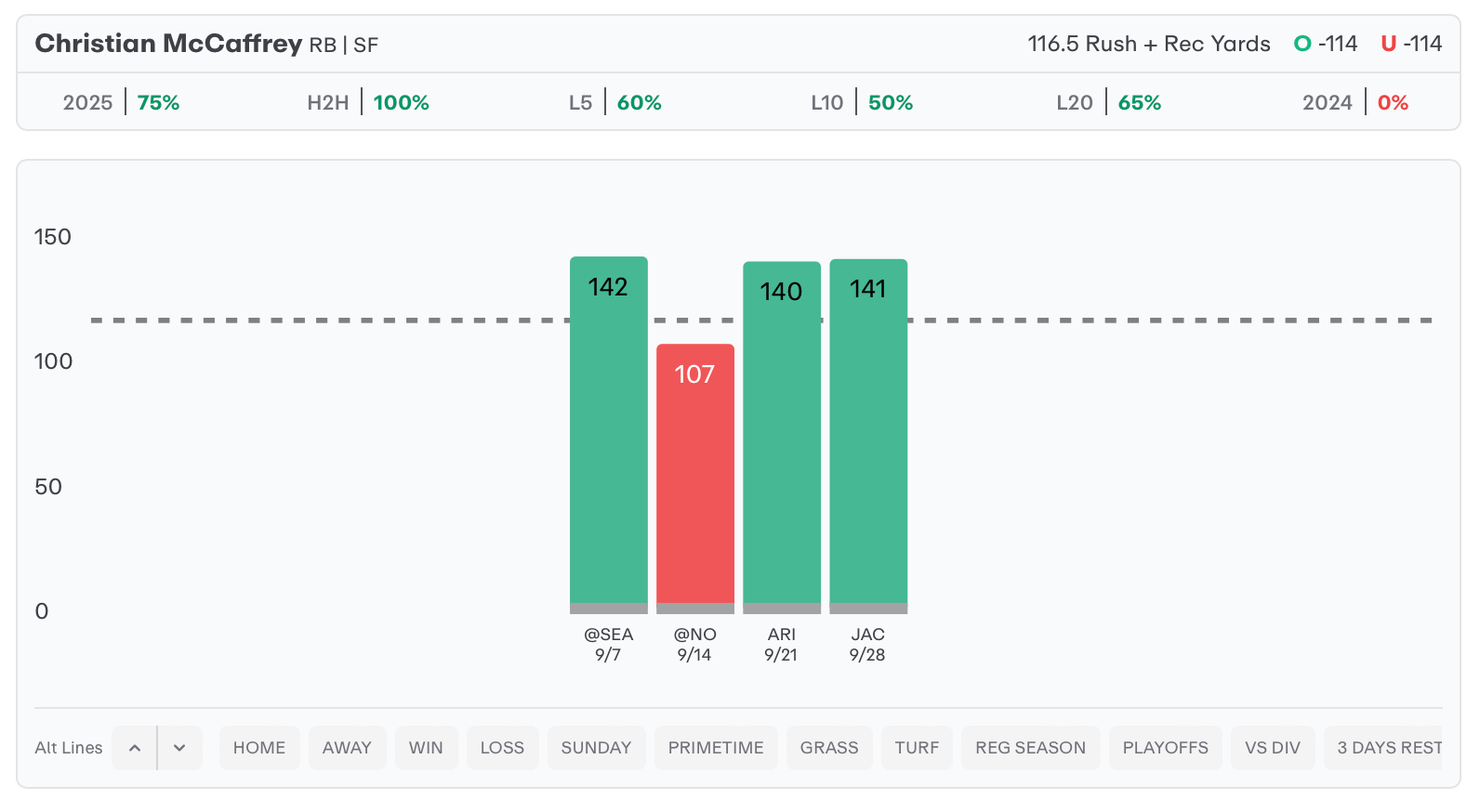 Christian McCaffrey o116.5 Rushing + Receiving Yards