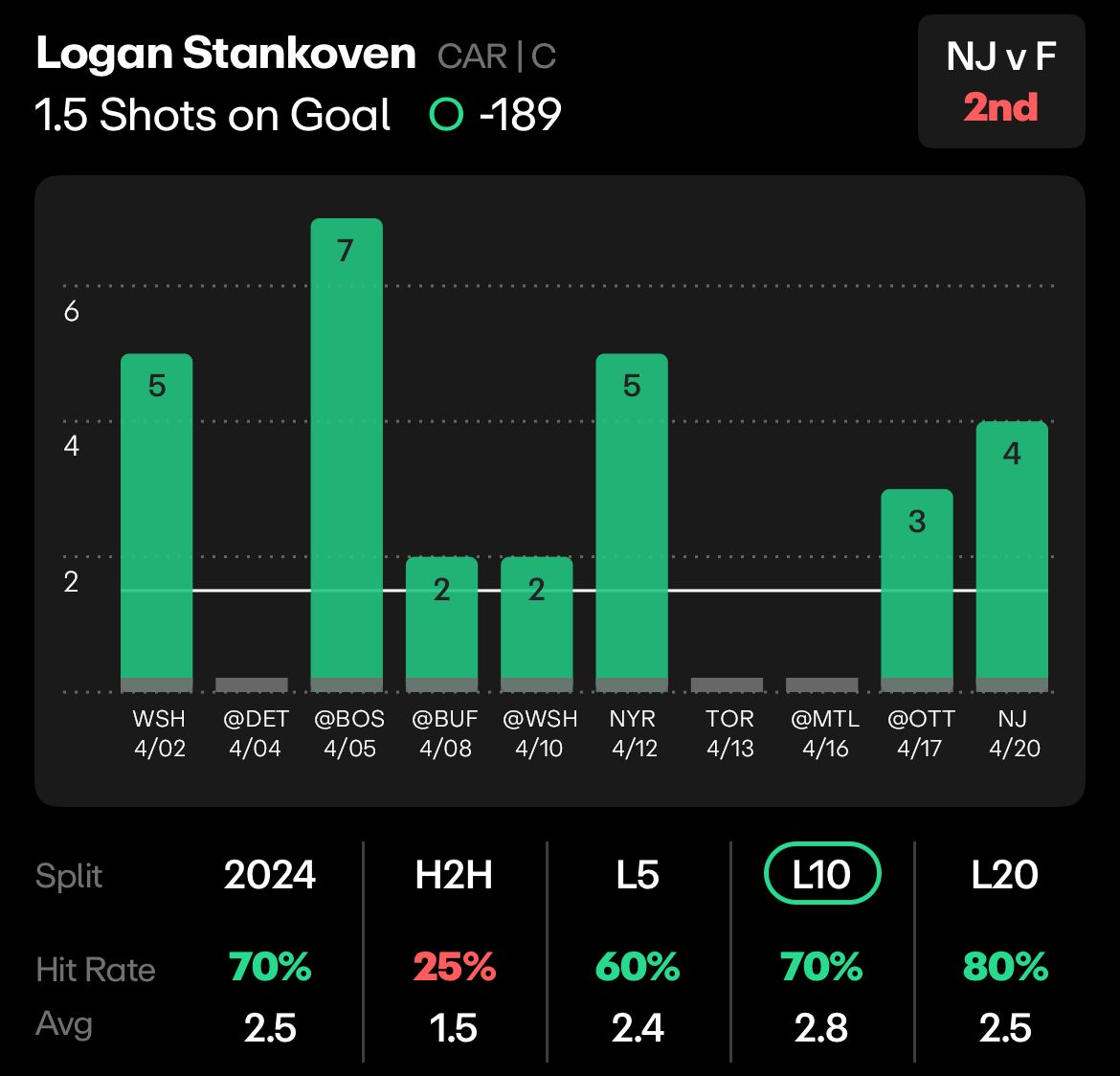 And he closed out the season averaging 2.8 shots on goal, going over this line in 7 of his final 10 games (including game one).