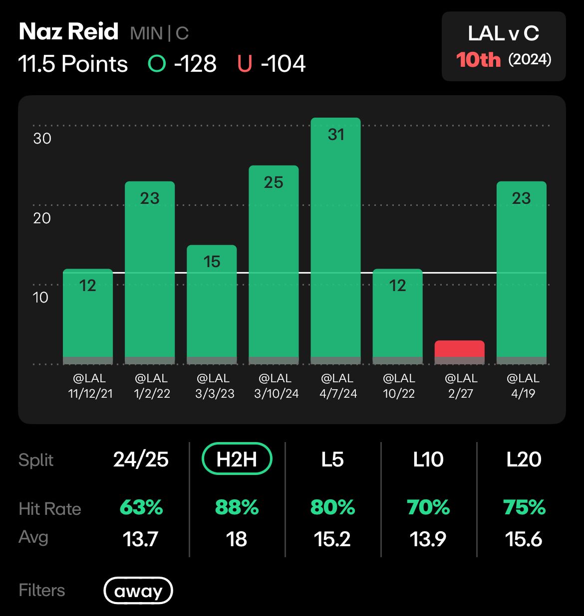 Naz Reid had 23 points in game one, and has gone over this number in 2 of three games in Los Angeles this season. The one he missed? He only had 2 points, but shot 1 for 10 from the field, even though he’s been a 45.8% field goal shooter this season, and he’s averaged 11.5 field goal attempts per game this season.