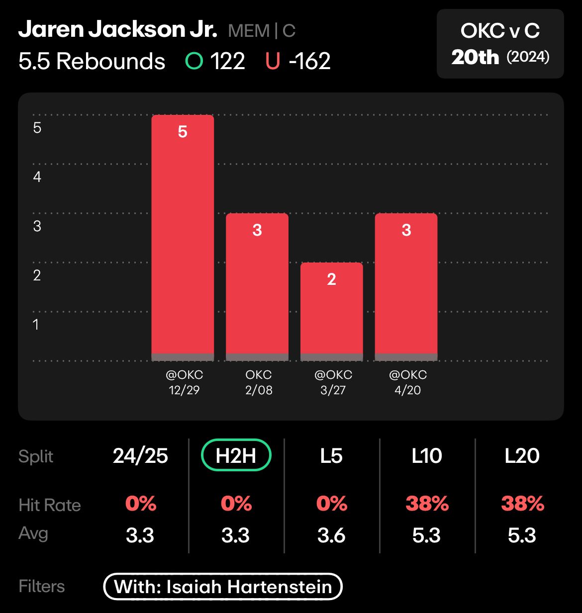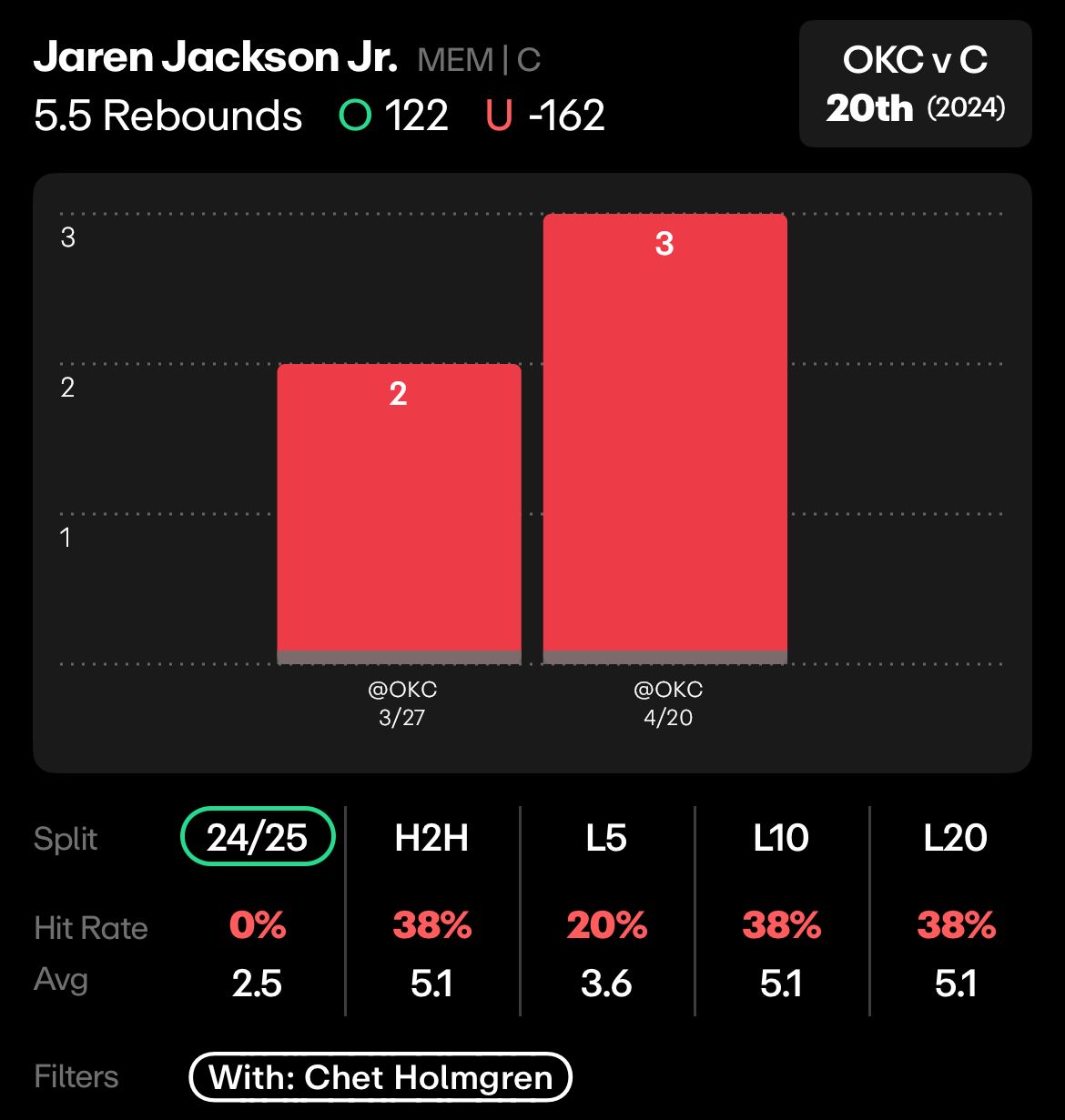 And in his four games against OKC this season overall (in which Chet missed two), Jackson Jr has gone under this 5.5 rebound line in all 4 games, averaging only 3.3 rebounds.