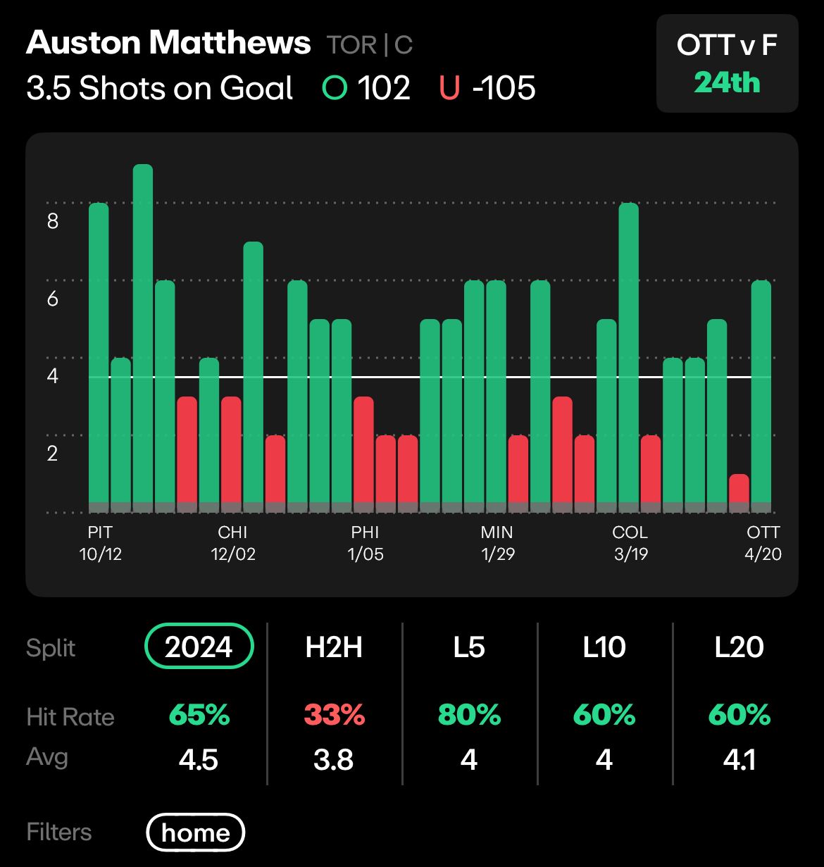 Auston Matthews, 3.5 Shots on Goal