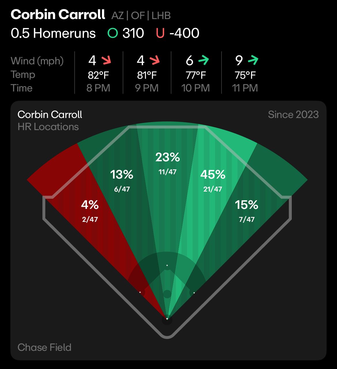Zach Littell has given up 6 home runs in his first 4 games, and left handed hitters have a 44% hard contact rating against Littell. Carroll has a .320 ISO this season, too, so there’s a lot of power in the bat in 2025. He already has 7 home runs this season, and the weather in Arizona plays into swing path tonight.