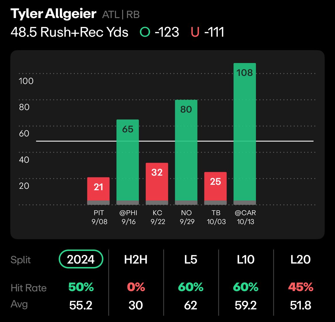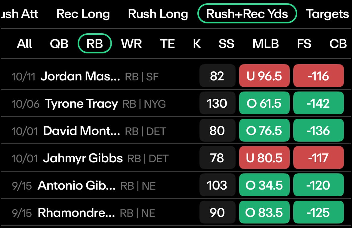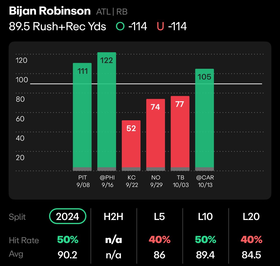 Robinson has gone over this line in both road games, averaging 113.5 rushing + receiving yards on the road, compared to 78.5 on average at home, where he’s been under this line in three of four games. His backup, Tyler Allgeier, is the same. He’s been over his line in both road games, averaging 86.5 rushing and receiving yards on the road, and been under in 3 of 4 road games, averaging 39.5 R+R yards.