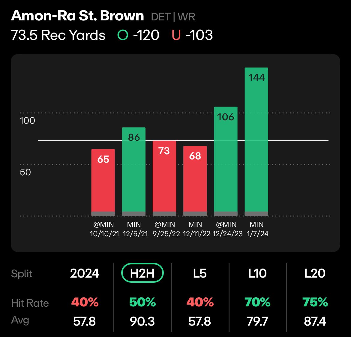 St. Brown is looking for his third straight 100-yard game against Minnesota, but he has struggled this year, with less than 50 yards in 3 of 5 Lions games.