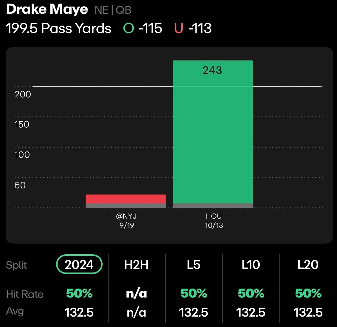 And behind a bad offensive line, and with a horrid receiver core, Maye managed to rack up 243 yards against Houston, the 4th best passing defense in the NFL. Maye’s line in week 7 is 200.5 passing yards, and if he can get near the 33 passing attempts he had last week, Maye should be able to find success in a spot like this.