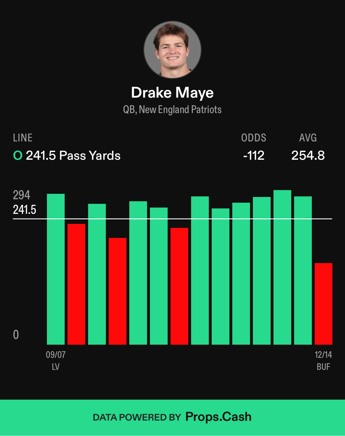 Give me the runner-up MVP! After a heartbreaking, gut-wrenching loss last week to Buffalo, this is a great bounce-back spot for Maye. His line is 241.5 passing yards, and he is averaging 254.8, with a 71% hit rate against this line.