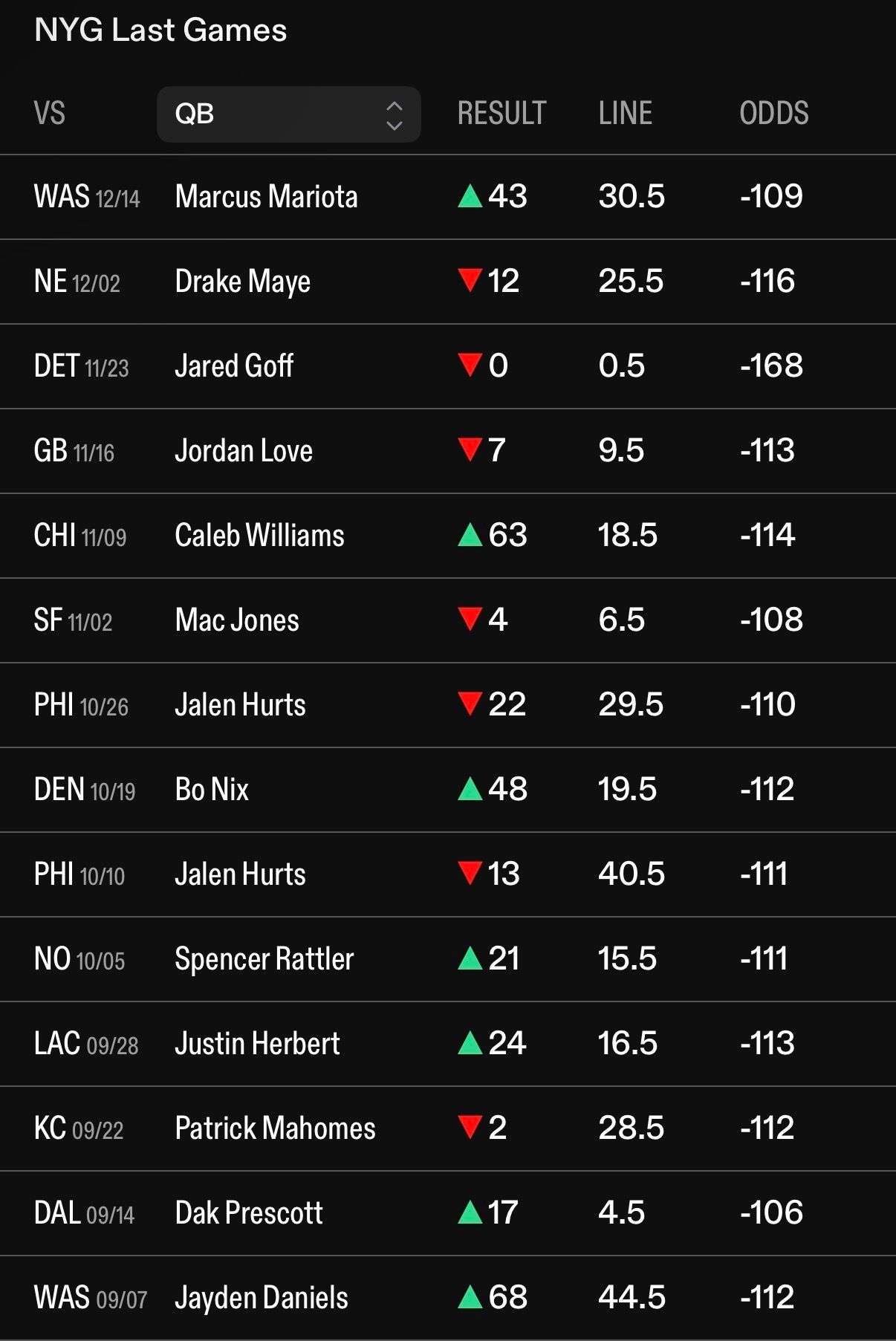 Although there’s a lot of under recently, we need to consider the most recent quarterbacks who would’ve gone under on McCarthy’s 14.5-yard line: Drake Maye, Jared Goff, Jordan Love, Mac Jones & Jalen Hurts. Goff, Love, and Jones are not mobile QB’s. Maye missed by 3 yards and Hurts by 2 yards.