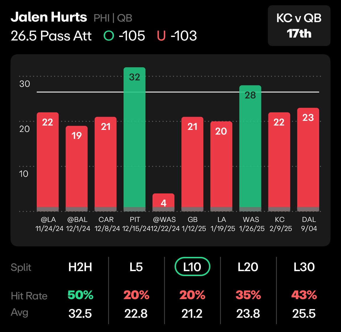 PHI vs KC: Jalen Hurts, Under 26.5 Passing Attempts
