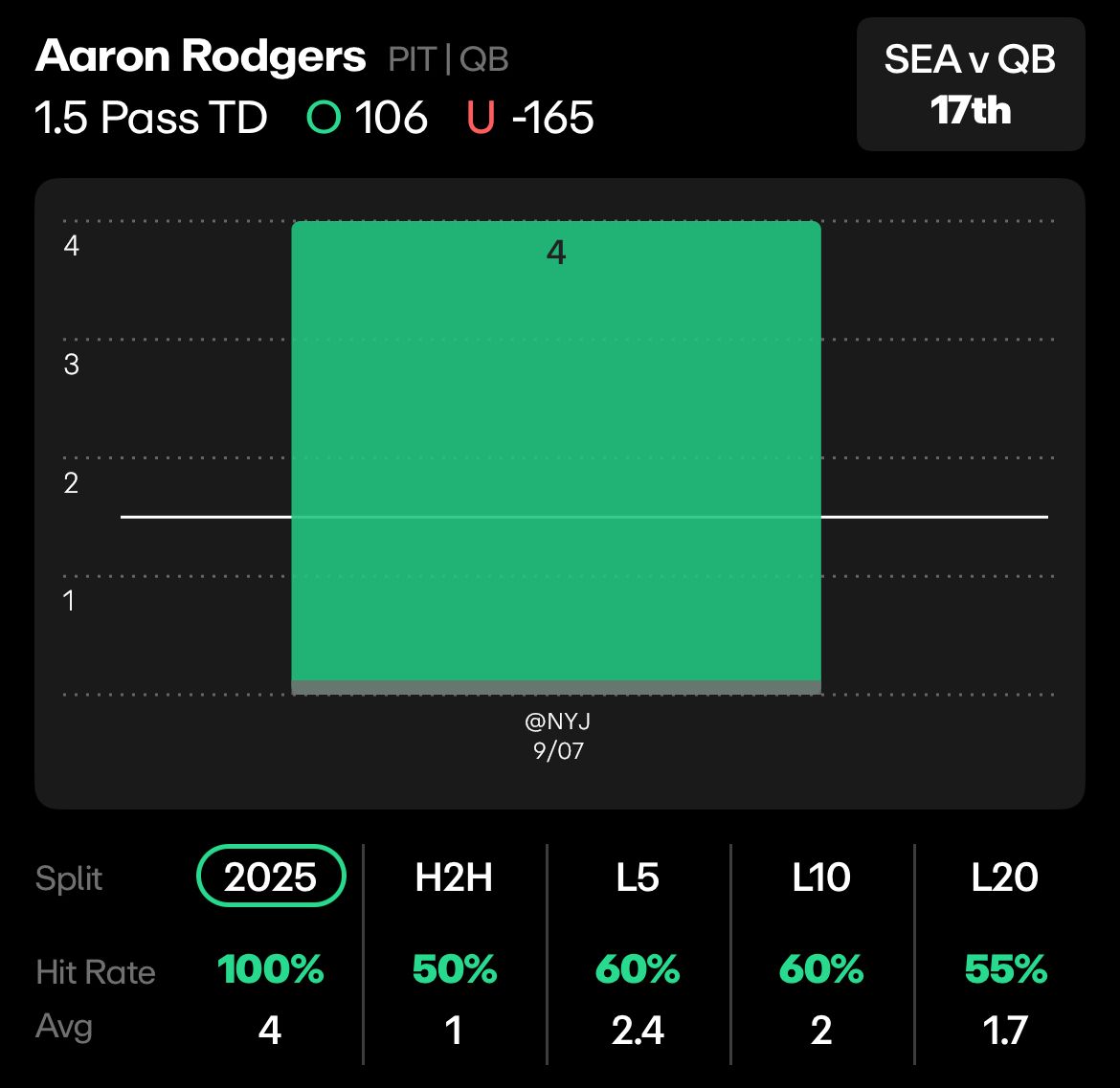 SEA vs PIT: Aaron Rodgers, 1.5 Passing Touchdowns