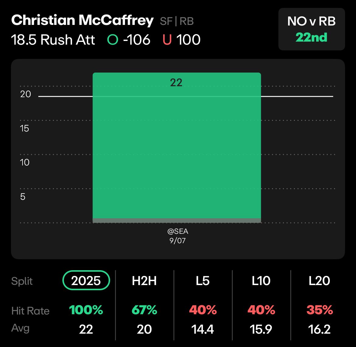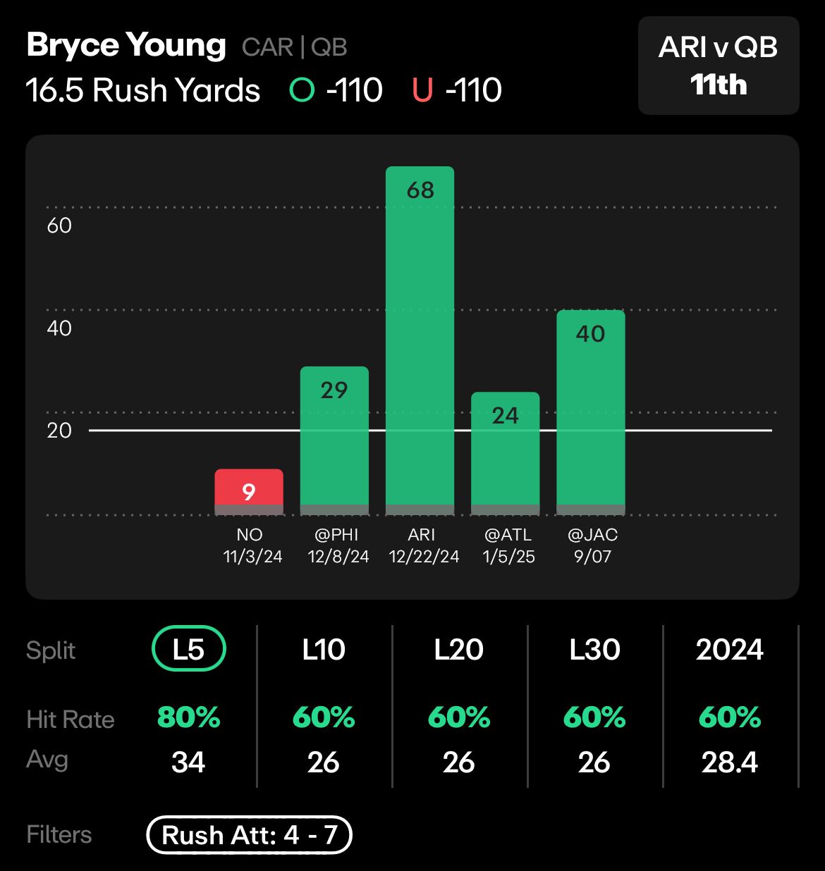 Young only managed 154 yards through the air in week one, but he eclipsed this rushing line easily, racking up 40 yards on just 5 attempts. And that’s what this will come down to - last season, he averaged 3.1 rushing attempts, but in his last 5 games with at least 4 rushing attempts, he’s averaged 34 yards per game.