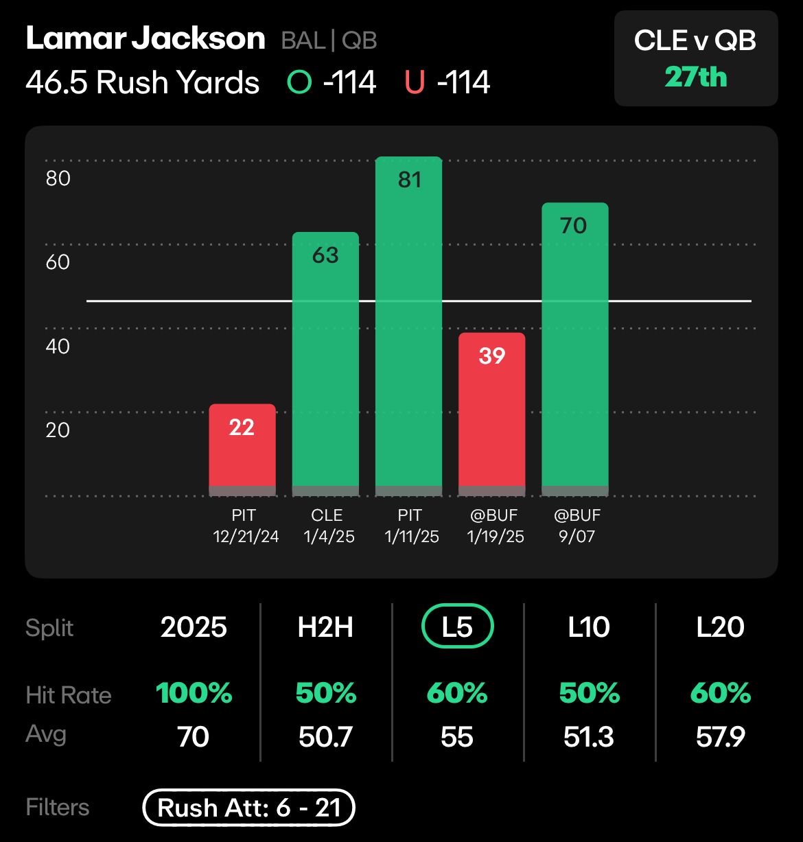CLE vs BAL: Lamar Jackson, 46.5 Rushing Yards