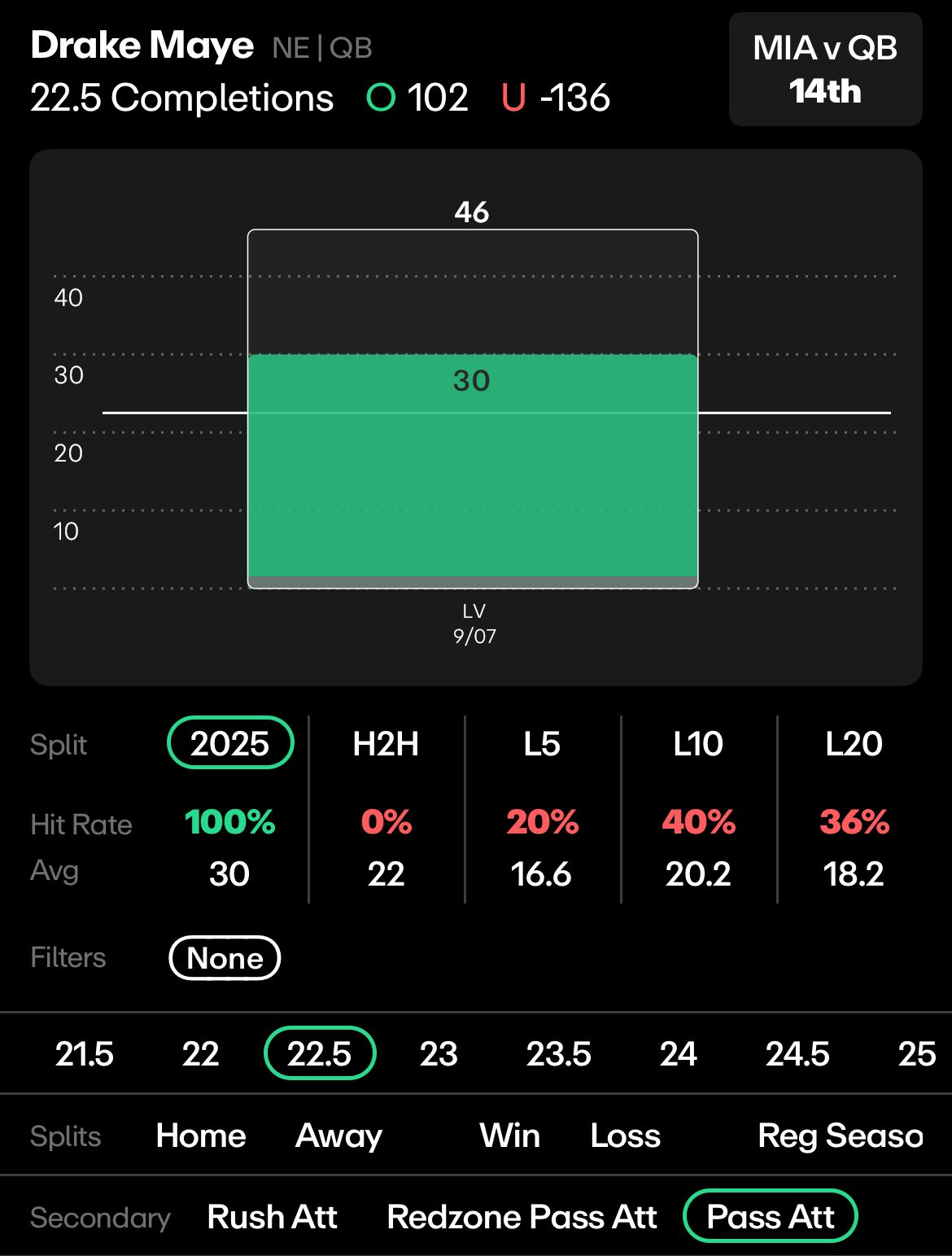 NE vs MIA: Drake Maye, 22.5 Pass Completions