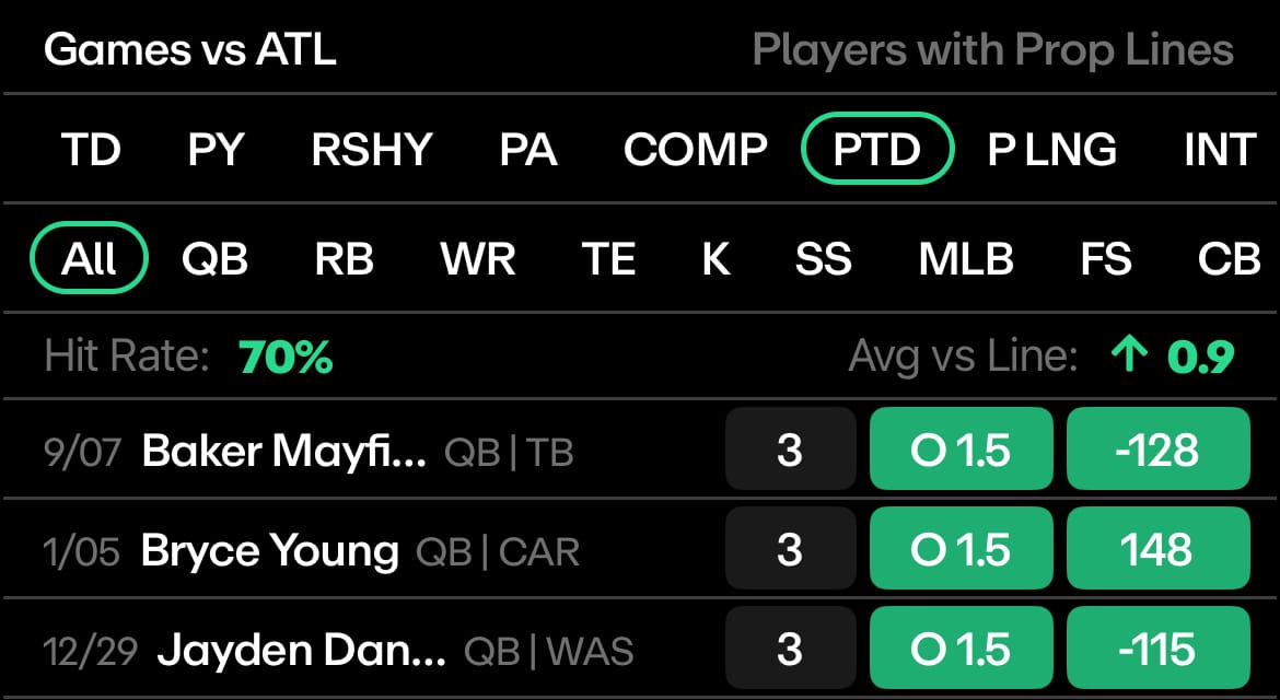 This week’s newsletter is packed with value: we’ve got a player prop trend for all 15 NFL games, hopefully giving you a clear edge heading into today and Monday. Plus, we highlighted 3 of our favorite matchups in more detail over on our YouTube channel — make sure to check those out if you want the deeper dive.