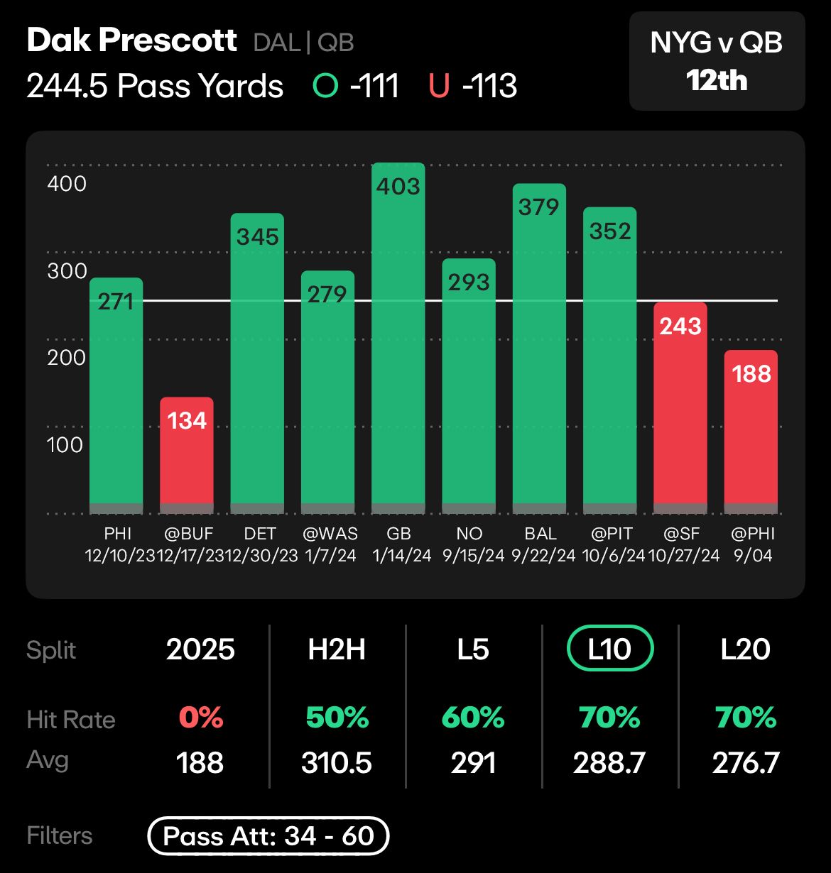 Precott’s Passing Yards, his L10 games with 34 or more passing attempts