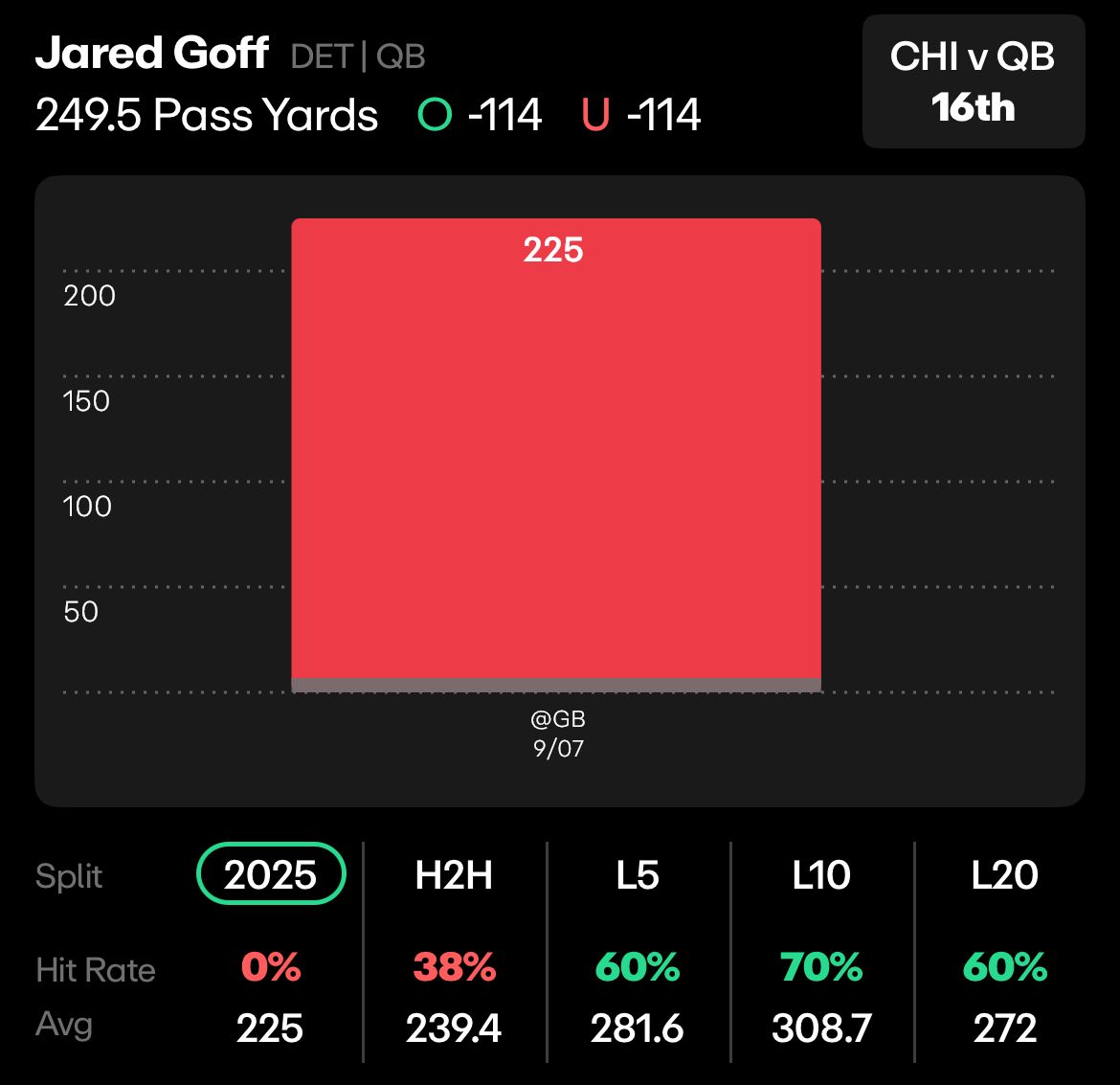 CHI vs DET: Jared Goff, Under 249.5 Passing Yards