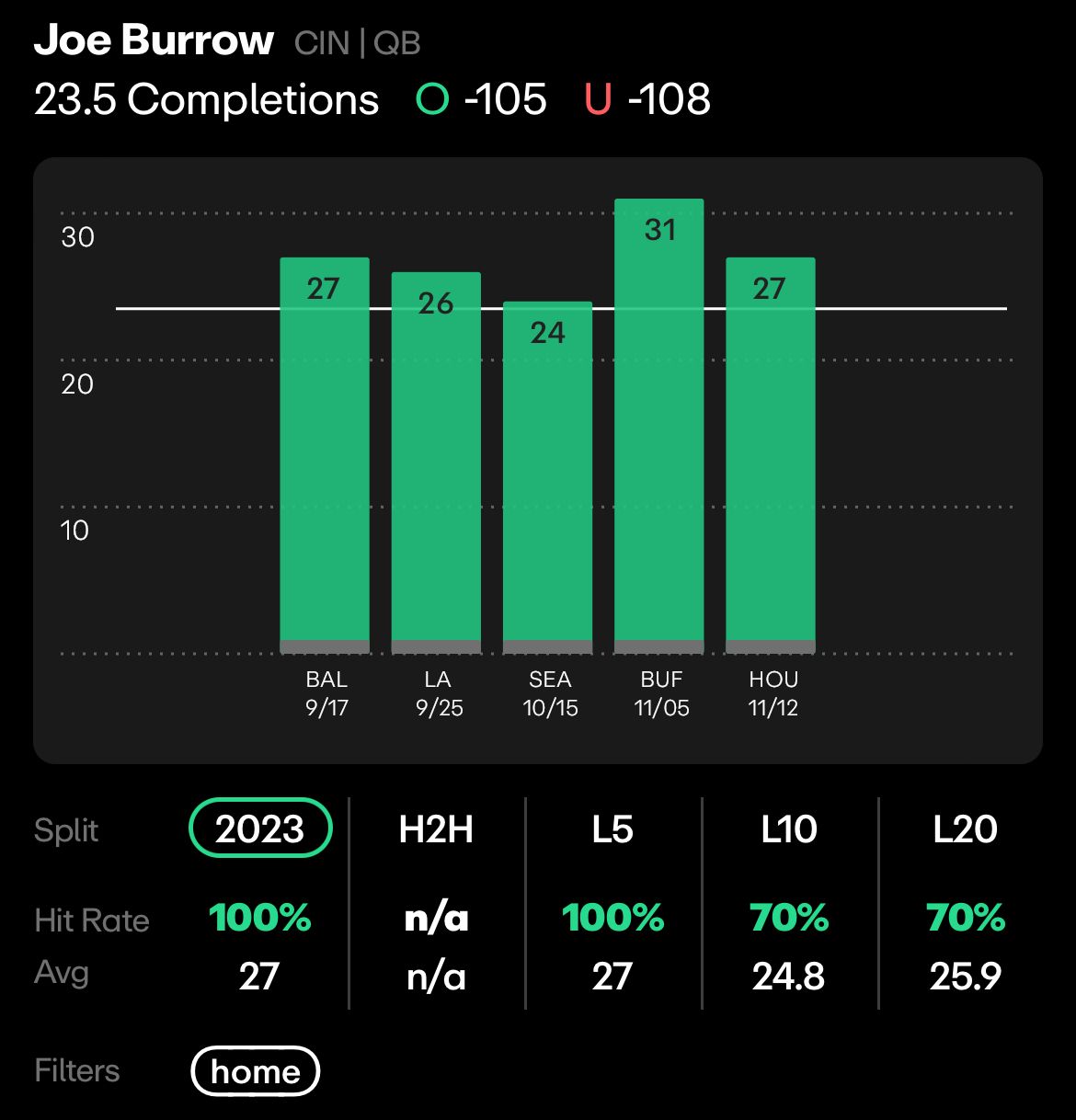 Joe Burrow did well at home against this line last year