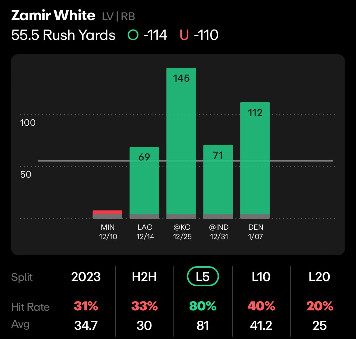 Josh Jacobs went down with an injury late last season, and the Raiders turned to White. What did he do? Cooked this line in 4 straight games, including two 100-yard performances. This Chargers D is going to be bad, and White should take advantage.