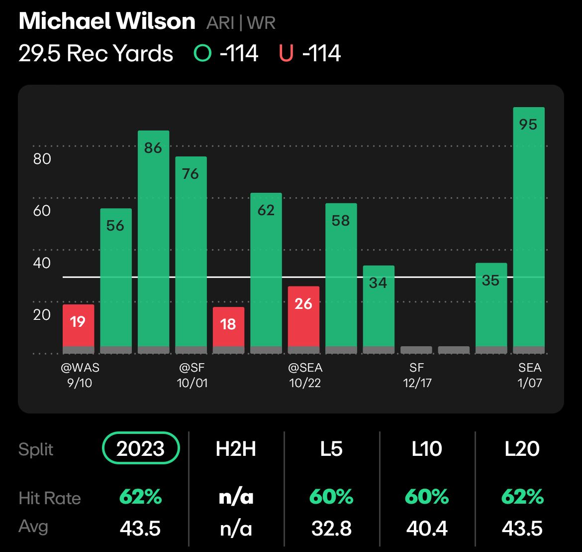 In an offense with Marvin Harrison Jr, Trey McBride, James Conner, and Kyler Murray’s legs, highlighting arguably the fifth option comes with risk. But Wilson should get some open looks with so many other weapons for the Bills to worry about, and he was over this line in 62% of his starts last season without a player of Kyler Murray’s pedigree under center.
