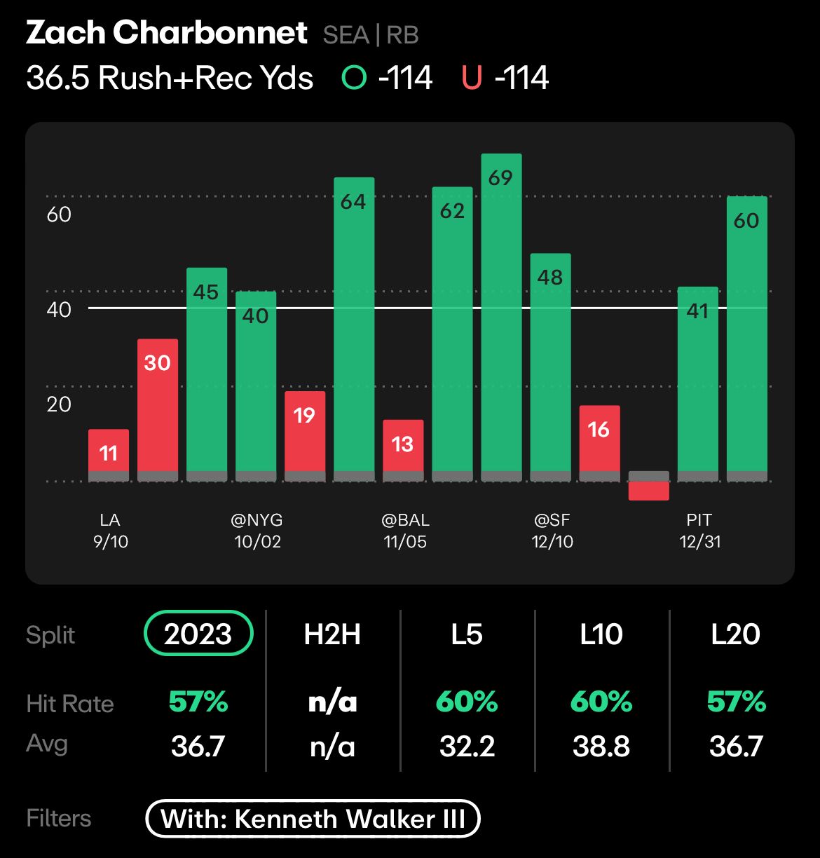 Charbonnet is headed into his second season, and he’s avoided the injury report this week so we can assume he’s ready to go for week one. Yes, he’s an RB2 behind Kenneth Walker but a high RB2, and against this line last year he went over in 57% of his games with Walker in the lineup. Not to mention the Seahawks play a work-in-progress Broncos defense with an elite secondary, but a not-so-worthy defensive line.