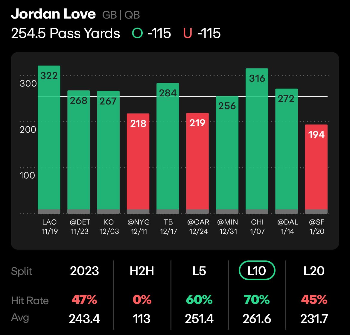 The first half of the season for Love and the Packers was completely different than the second half, and in the second half, Love eclipsed this line in 6 of his last 10 games (narrowly missing by one yard in another one of those games).