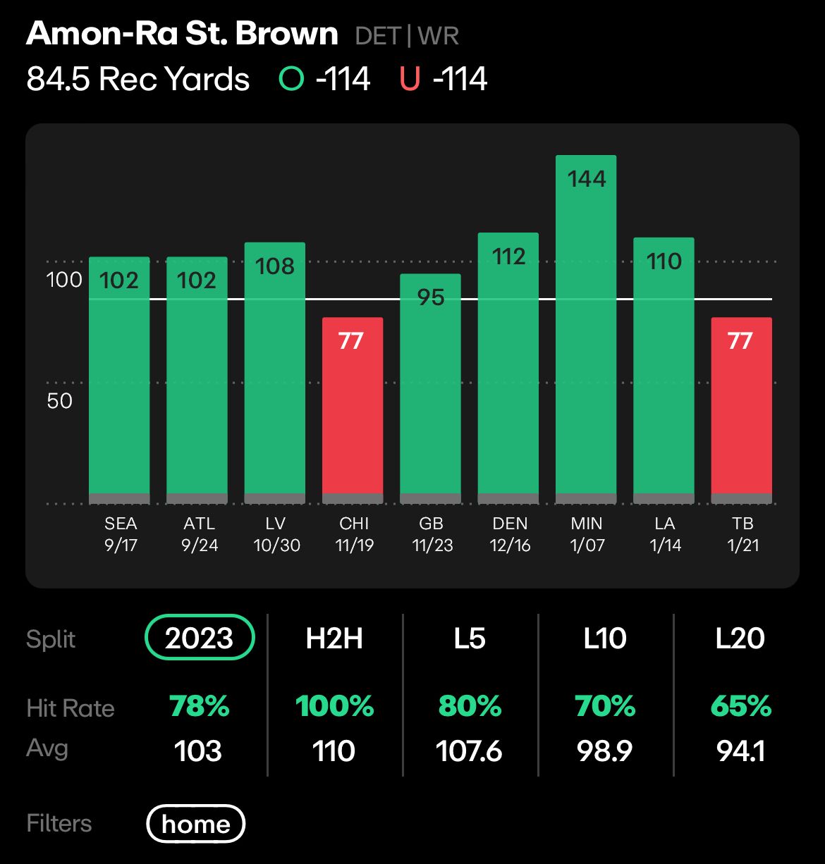 He went over this line in 78% of his games last season at home, and in the only two he missed he had 77 yards, a piece. The Rams improved their D, but St. Brown should still go over this line as long as the Lions play like they did last year.