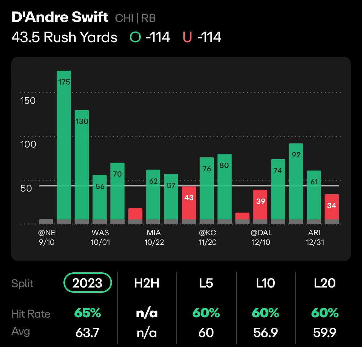 Bears vs Titans, Sunday 1 PM: DeAndre Swift Over 43.5 Rushing Yards